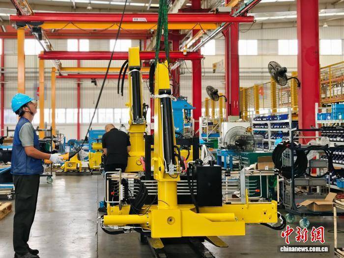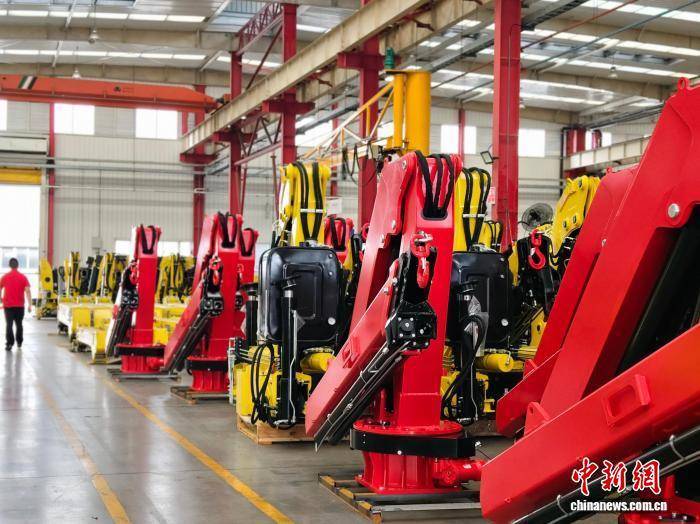 9月19日,江苏扬州,海沃国际集团亚洲区总部车间内展示的折臂式起重机。中新社记者 徐珊珊 摄