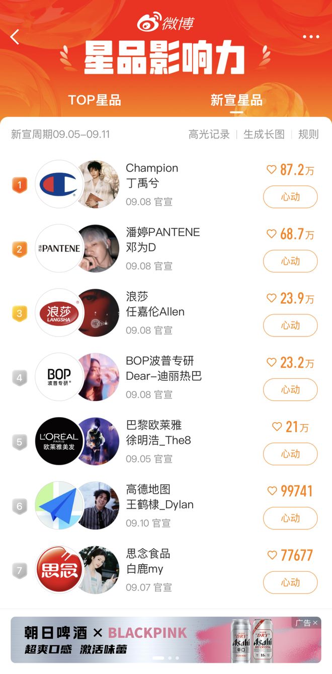 像前面提到的微博星品影响力榜单,不仅是企业会盯着看,其实也是粉丝们的关注焦点,他们会时刻关注自家明星的表现、数据,与其他明星相比的排名。