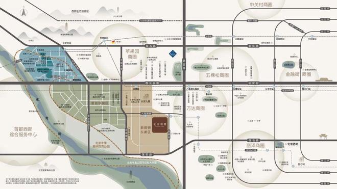 三横——长安街、莲石路、阜石路;三纵——西五环、古城南街、北辛安路,交织贯通形成立体路网。从项目出发可沿长安街快速到达、王府井、西单;沿阜石路向东可快速到达中关村、金融街;经五环、四环向西可直达总部基地、丽泽商圈。